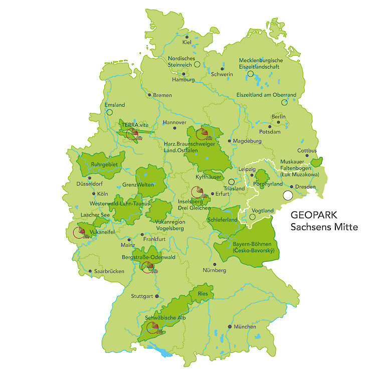 Aktuell gibt es 17 zertifizierte Nationale GEOPARKs in Deutschland. Der GEOPARK Sachsens Mitte bewirbt sich derzeit um den Titel.